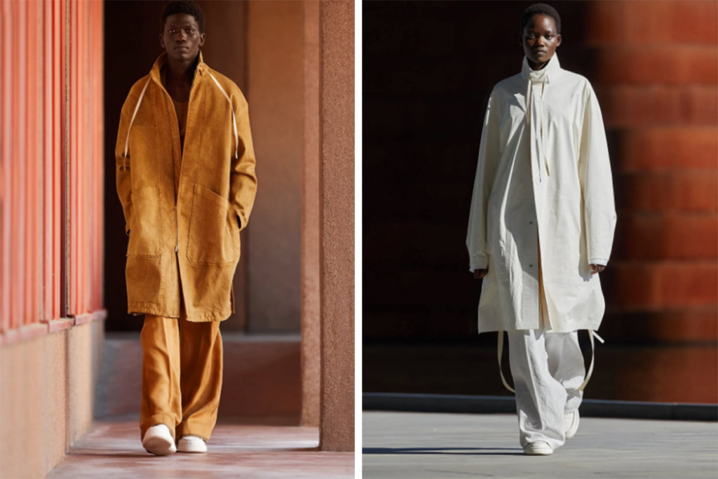 Cappotti lunghi e giacche a kimono, stretti in vita da un nastro; grandi spolverini leggeri e giacche a taglio camicia, in pelle di vitello liscia dall’effetto da sembrare cotone. Camicie, bluse e t-shirt oversize su shorts e pantaloni ampi, per look che tono su tono ma abbinabili e mixabili.