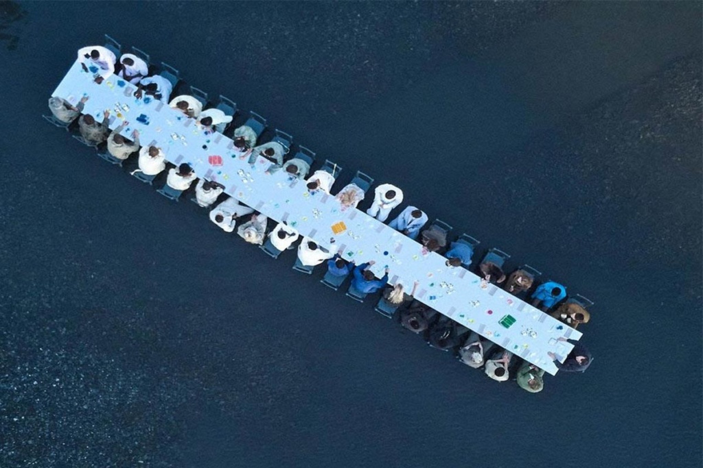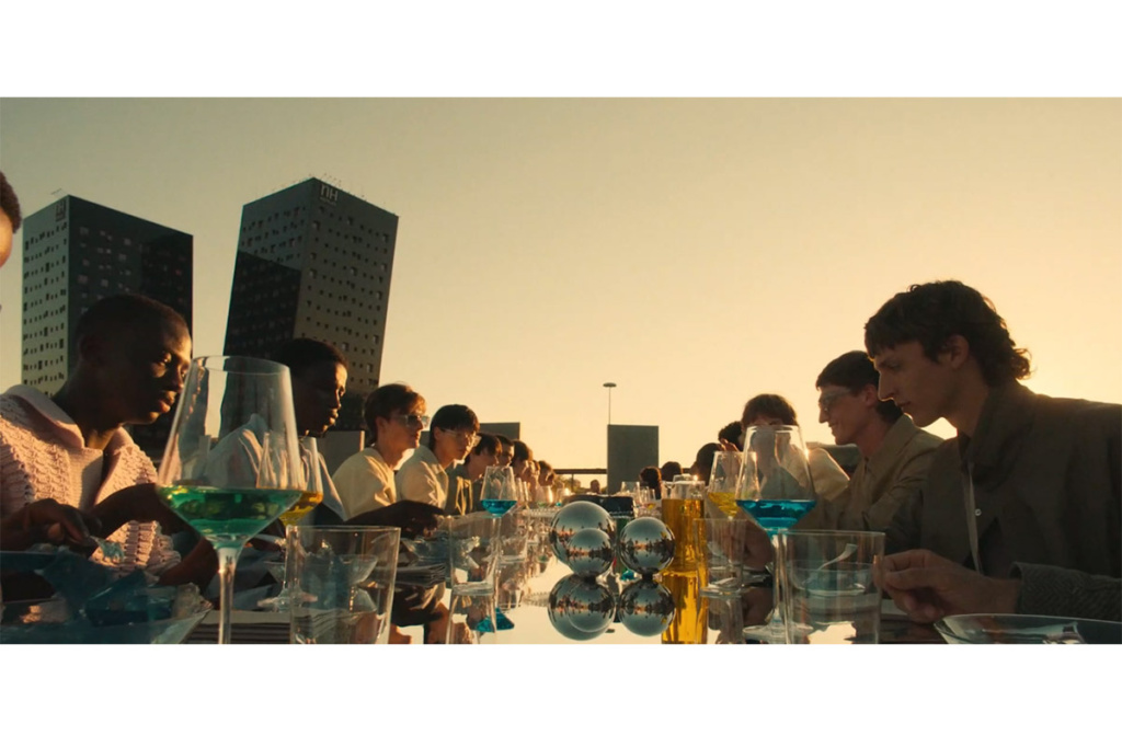 Zegna ci ha portato in un viaggio profondamente urbano- industriale ma allo stesso tempo arioso, in un quartiere milanese periferico costruito da Aldo Rossi negli anni ’60 e ’70. Circondati da uno scenario architettonico imponente, i modelli e le modelle, hanno sfilato in un piazzale spopolato fino a trovare posto davanti ad un mega-schermo; il tutto con sullo sfondo le torri pendenti di Dominique Perrault, a Rho, alle porte di Milano. Nella conclusione del video sul mega-schermo alcuni modelli hanno preso posto, camminando sull’acqua, in un lungo tavolo allestito dentro le acque di una fontana, per brindare con gioia alla loro ritrovata libertà.