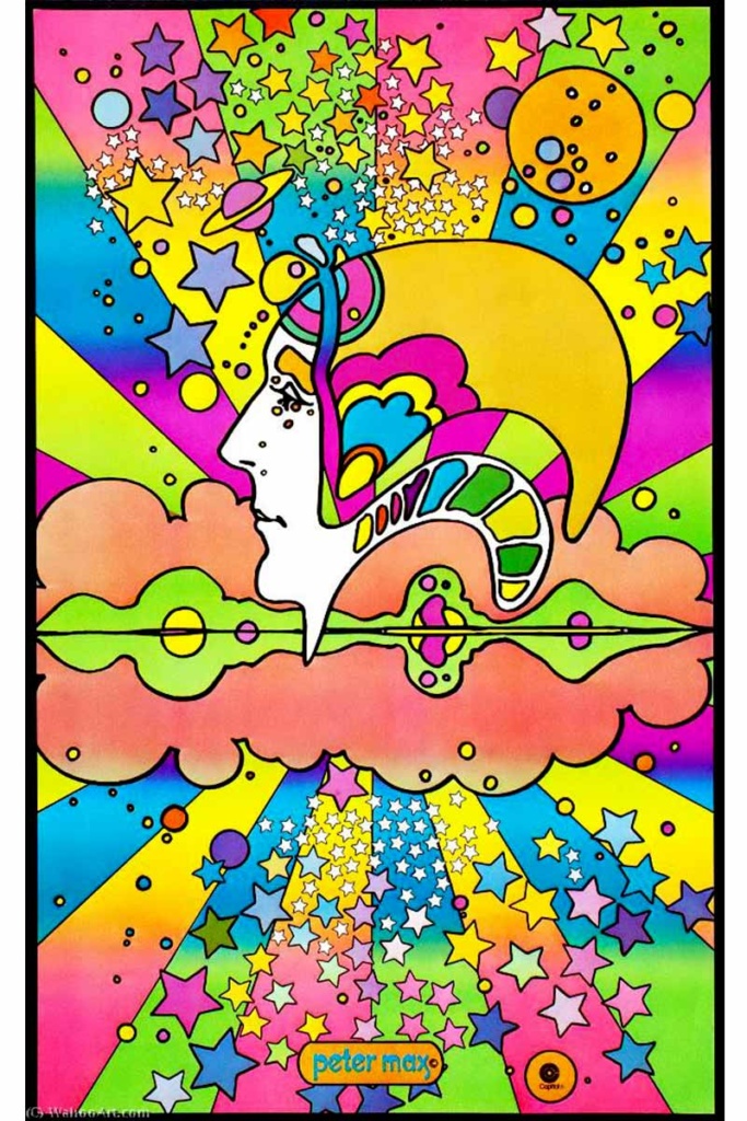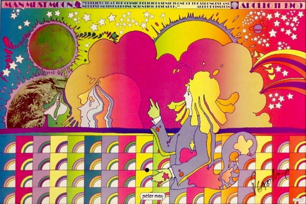 Simile al re della pop art, Peter Max si esprime attraverso una varietà di tecniche, tra cui: pittura, disegno, scultura, collage, incisione, video e immagini digitali. Ampiamente associata alla controcultura e ai movimenti psichedelici degli ultimi anni ’60 e dei primi anni ’70, la carriera di Max rispecchia da vicino quella di Andy Warhol; attraverso il suo focus estetico, il suo stile visivo unico e l’uso di un’ampia gamma di media artistici. Grazie alla sua predilezione per le esplosioni di colore, la maggior parte del suo lavoro contiene gran parte o tutto lo spettro cromatico. La sua attenzione, già dagli esordi, per celebrità, politici, musicisti, atleti e altri soggetti della cultura pop, ancora una volta elemosinando il confronto con Warhol, gli serve come via d’accesso nei campi della progettazione grafica e della pubblicità.